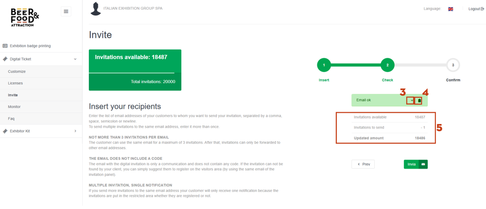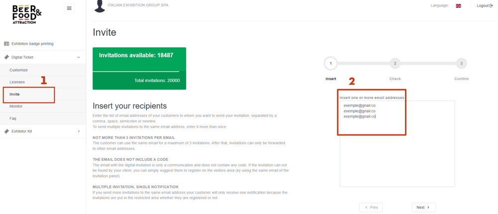 After logging in to the private area with the credentials received by e-mail, select from the menu on the left ‘Digital Ticket’ - ‘Invite’ (see box 1 in figure) enter the e-mail addresses to which you want to send the invitations (see box 2 in figure):