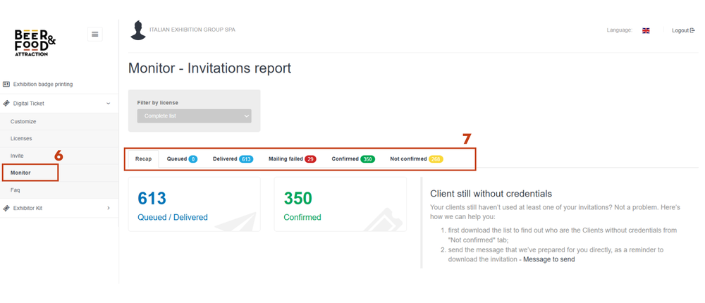 - Monitor how many invitations you are sending and how many remain at your disposal (see 3 in figure):