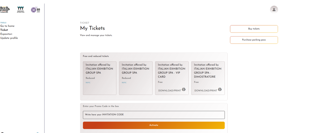 By clicking on ‘Register’, your guest will be redirected to the registration page of the Beer&Food Attraction website, and by completing the registration he will access his reserved area where he will find his ticket. If, on the other hand, you have already registered in the past, the ‘quick access’ button will appear.