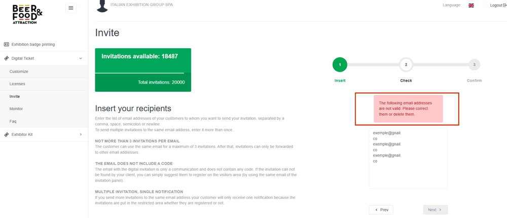 Once uploaded, you will receive feedback on the validity of the e-mail addresses entered and, if necessary, correct them (see box in figure):