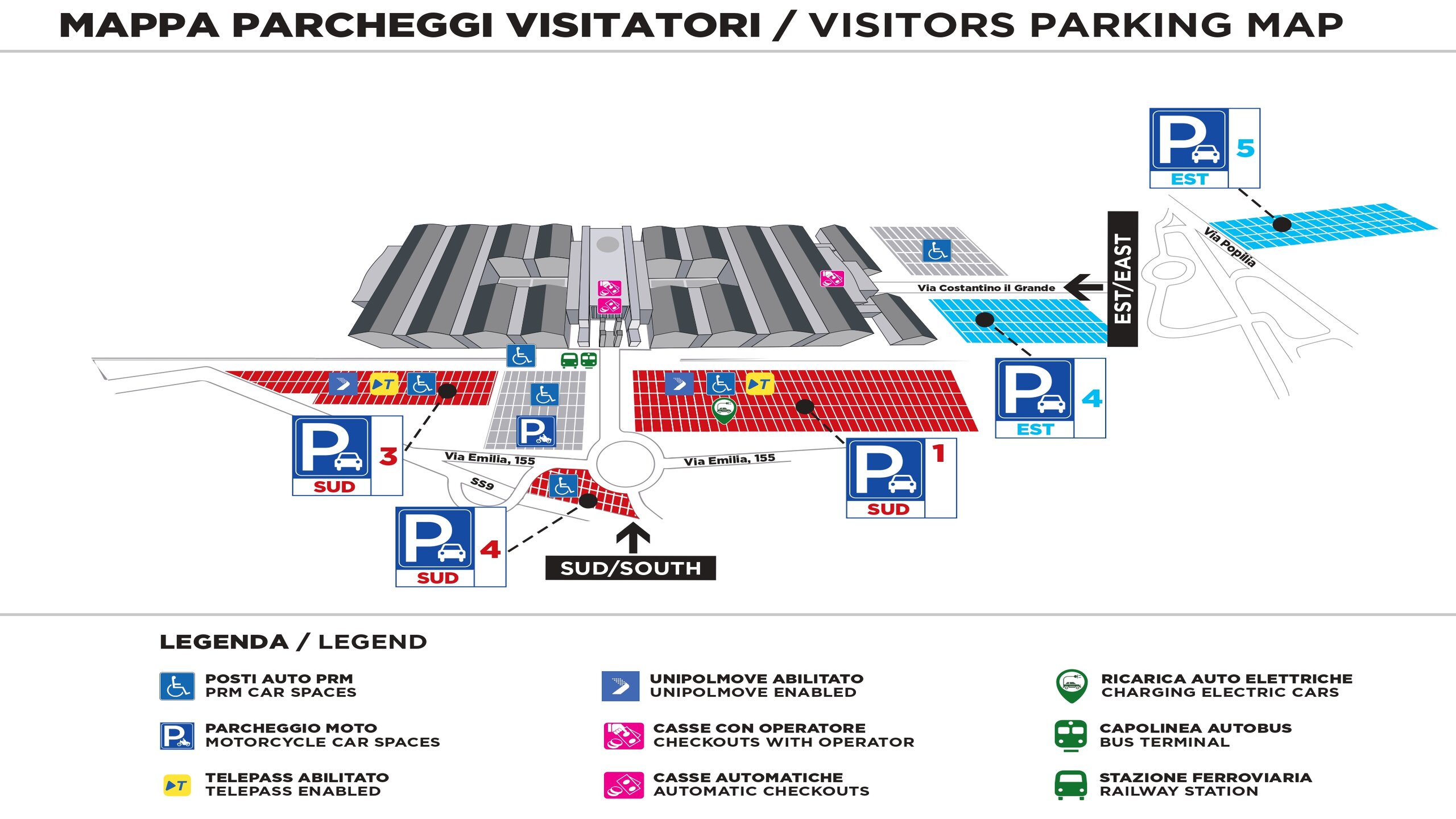 The parking areas of the vehicles, identified with suitable signs, are located at the South Entrance.