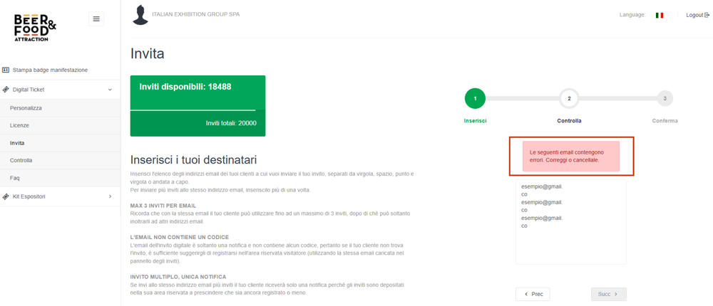 Gli invii che falliscono (dovuti a errori nell’indirizzo o server di destinazione) saranno nuovamente a tua disposizione. Alla stessa persona puoi mandare nuovamente l'invito. Il destinatario riceve un’unica e-mail di notifica e troverà gli inviti nella sua area riservata, tutti elencati come “Biglietto offerto da…” tua ragione sociale.