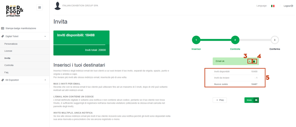 - Monitorare quanti inviti stai spedendo e quanti rimangono a tua disposizione (vedi 5 in figura):