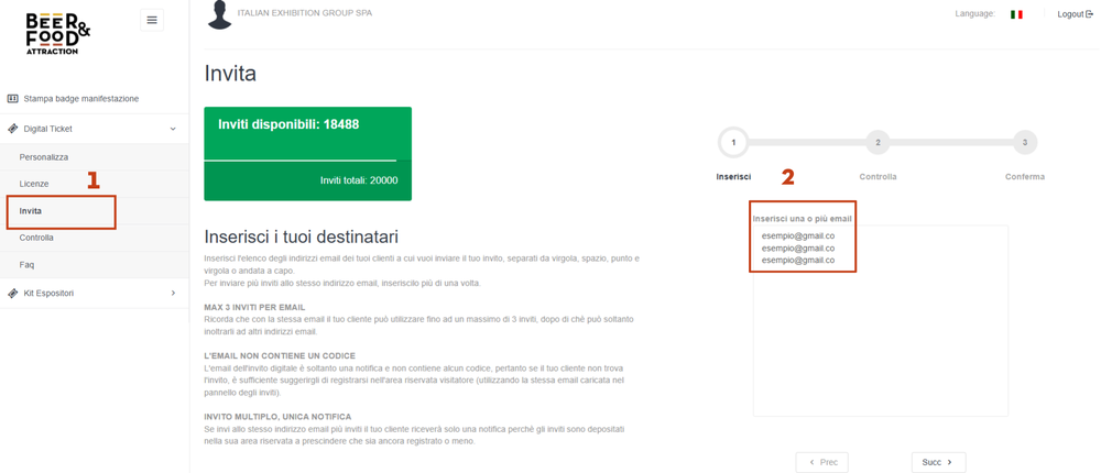 Dopo aver eseguito il login all’interno dell’area riservata con le credenziali ricevute via e-mail, seleziona dal menu a sinistra “Digital Ticket” - “Invita” (vedi riquadro 1 in figura) inserisci gli indirizzi e-mail a cui vuoi mandare gli inviti (vedi riquadro 2 in figura):